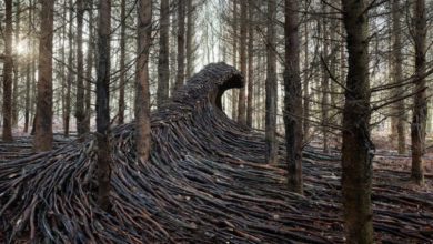 El escultor Jörg Gläsche llena de grandes olas de madera el suelo de un bosque cercano a Hamburgo